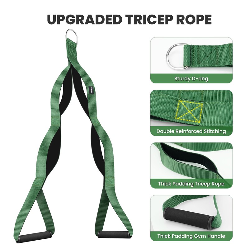 - 【Comfortable Grip, Anti Slip】- Comes with thick and soft padding for comfortable grip. Even when you do very heavy weights, tricep pull down attachment can also effectively protect your hands from injury. Fixing loops at each position of the attachment have been reinforced stitching to prevent the grip from slipping.