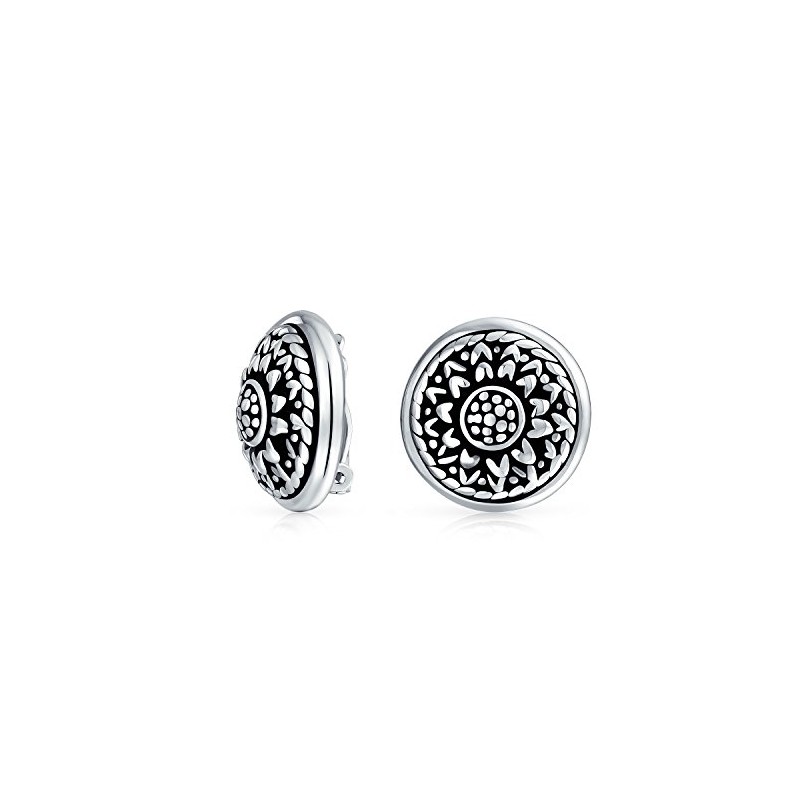 Bali Style Round Dome Medallion Style Flower Motif Button Clip On Earrings Black Oxidized .925 Sterling Silver .85 Dia