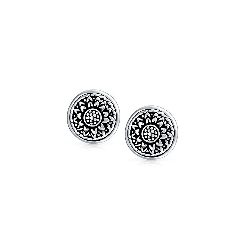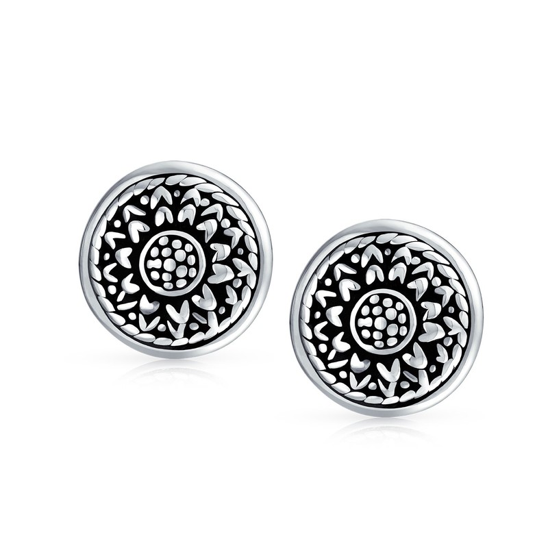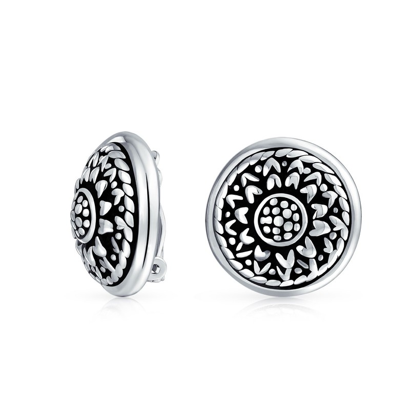 - Add a touch of floral flair to your ensemble with these silver clip-on earrings. Featuring a carved sunflower design and oxidised details. These beautiful flower stud earrings complete your look.