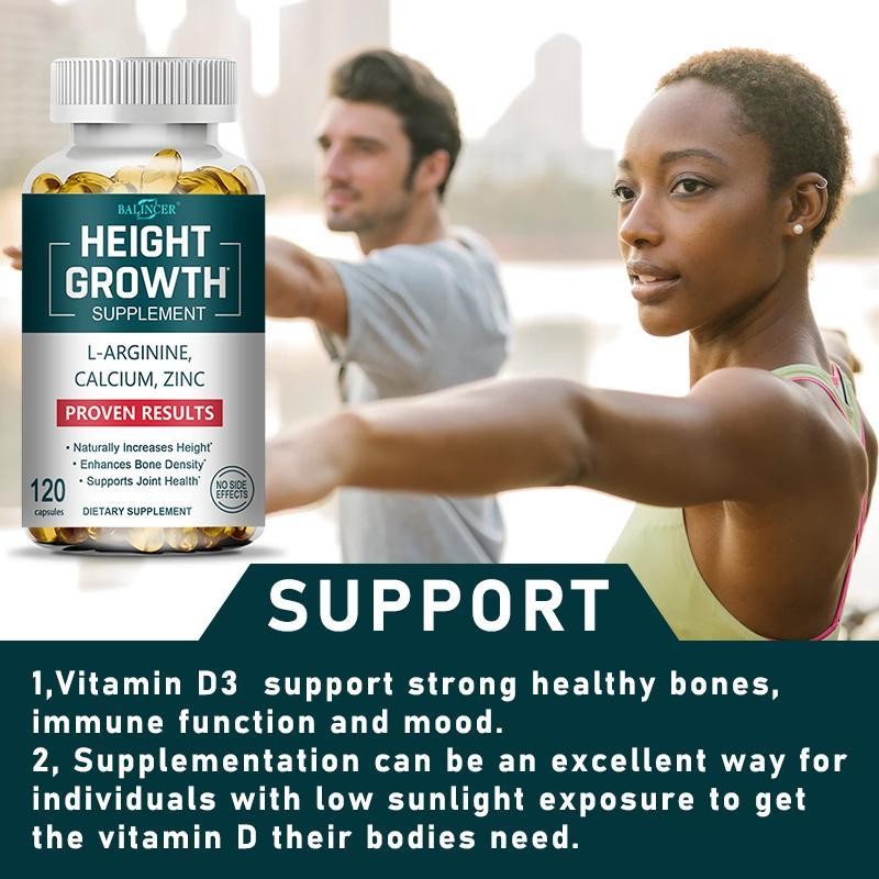 Balincer Calcium + Vitamin D3 Health Supplement is designed to support strong bones, joint health, and height growth in adults. This vegan-friendly formula combines calcium, vitamin D3, and zinc to promote bone density, overall skeletal health, and optimal nutrient absorption. Each capsule is free from allergens and crafted to support daily wellness.