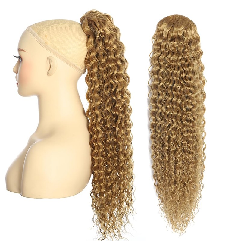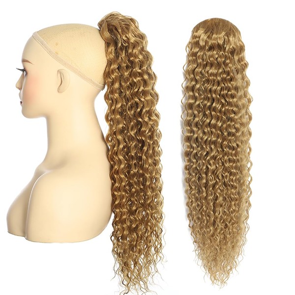BALINGHAIR Deep Wave Ponytail Extension for Women 24 Inch Light Brown Curly Wavy Ponytail Hair Extensions Drawstring with Clips Short Synthetic Hairpiece for Daily and Party