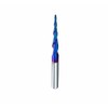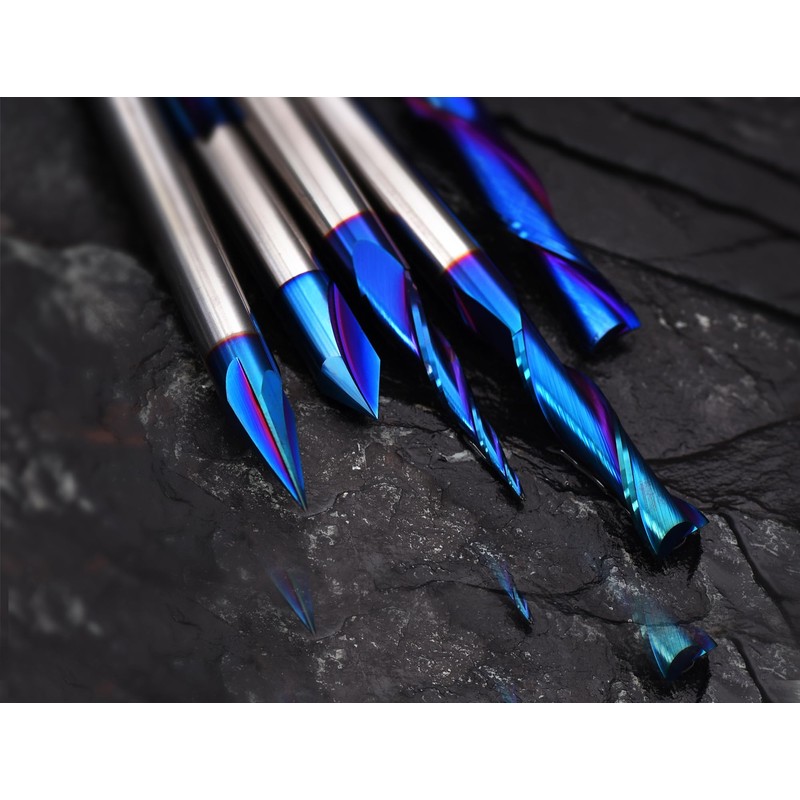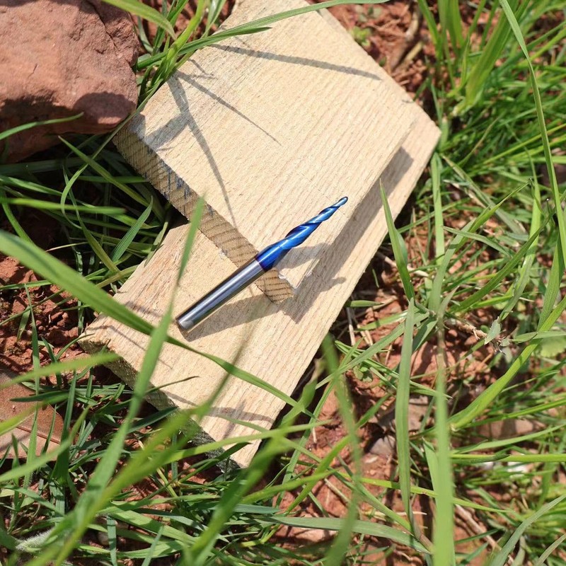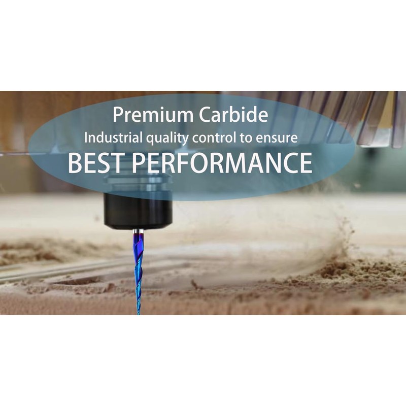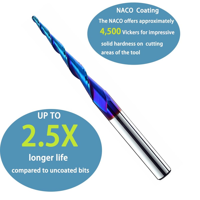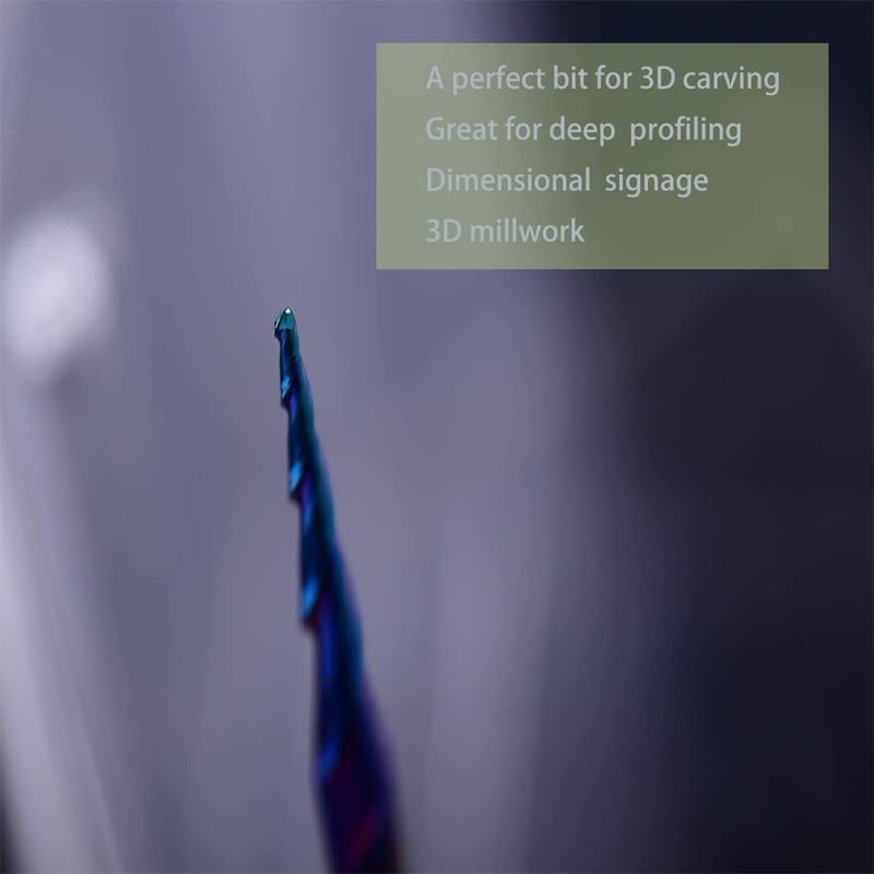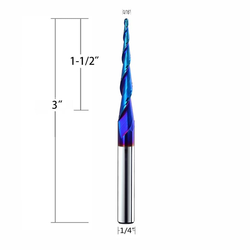 Industrial Solid Carbide CNC 2D and 3D Carving Tapered Ball Nose. NaCo Coated Router Bit allows you to achieve precision, depth, unparalleled accuracy, detail and clarity in foam and other modern-day materials. This ZRN coated end mill has a 1/4" cutting diameter x 1" cutting length. The overall length is 3" with a 1/4" shank. With the added coating, the bit’s lifespan and durability are increased substantially avoiding unnecessary down time. These bits pull the wood chips up and away from the tool path which helps prevent tool breakage and extends the life of the bit.