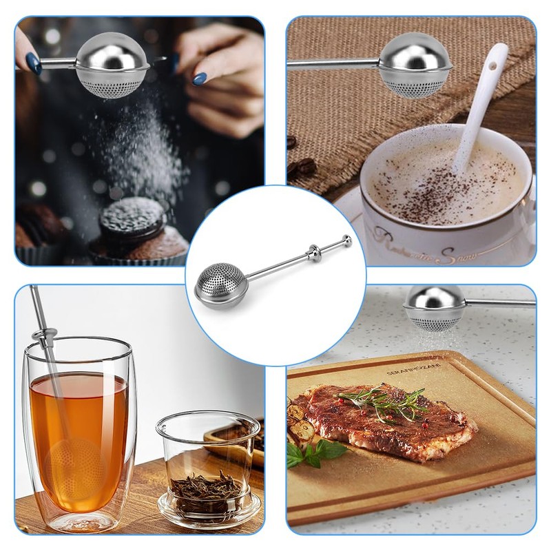 EASY TO USE: This flour sifter is made of high quality materials for long term, repeated use, our flour sifter is designed with a spring loaded handle for easy one-handed operation. The small holes on this flour sifter are evenly distributed in size and can be used for straining tea as well as coating other ingredients such as flour, salt, pepper and spices.