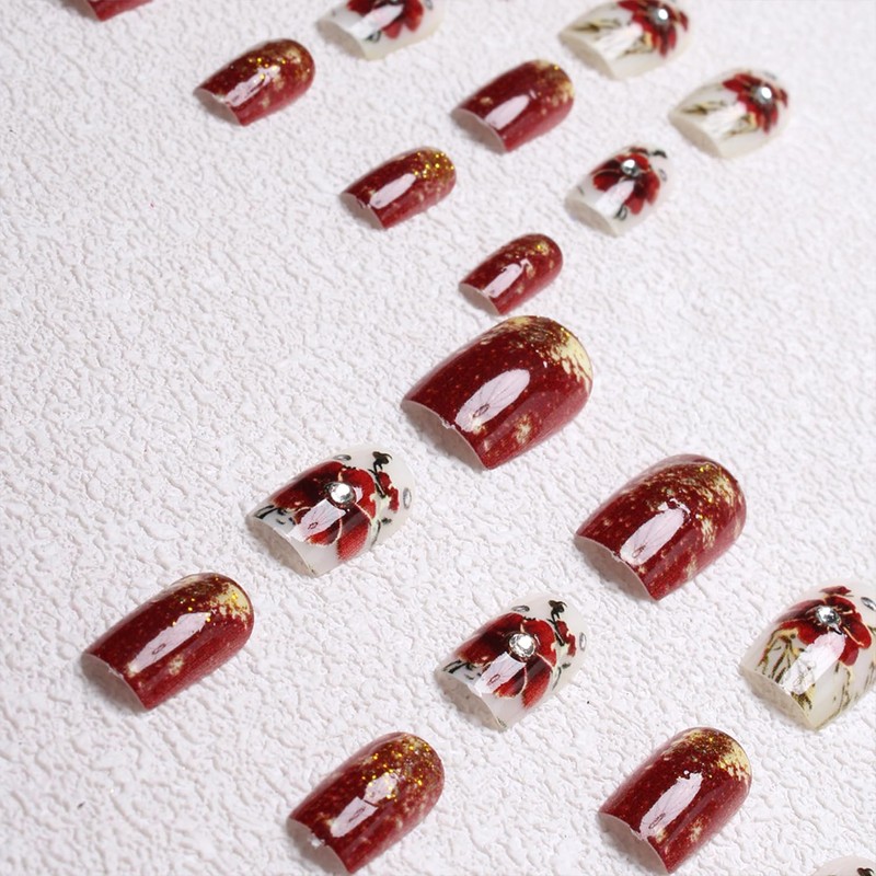 Ballerina Red Flower Press on Nails Gold Foil Rhinestones Stick on Nails Long Square Artificial Fake Nails with Glue Glossy Acrylic False Nail for Women