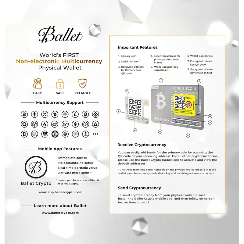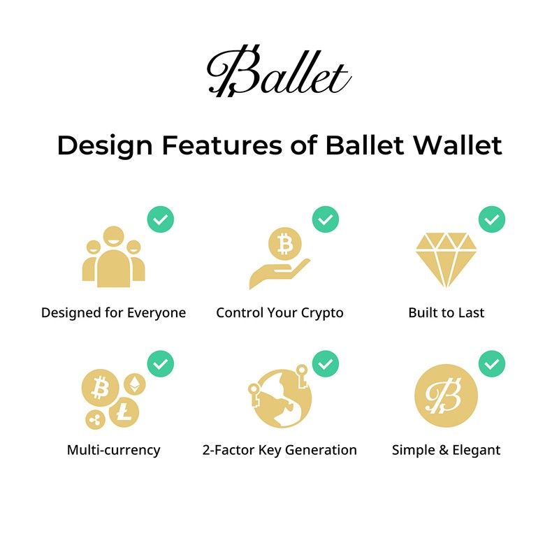 • 1. Ballet wallets are our solution to make cryptocurrency easy for everyone. They offer a simple and elegant user experience that allows new crypto users to receive, store, send, buy and sell cryptocurrency. Our innovative wallets are the world’s easiest-to-use cryptocurrency wallets: They are ready to use right out of the box and there are no accounts, no setup, no passwords, no electronics, and funds are stored 100% offline in cold storage with no risk of electronic hacking.