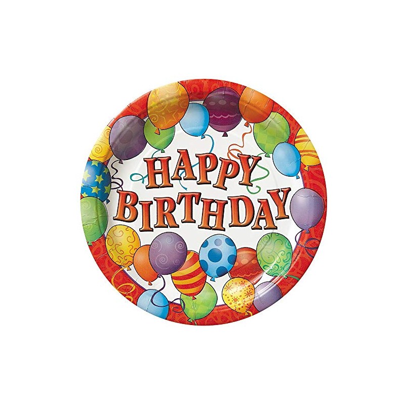 Pass out a tasty birthday meal in style with these Balloons Birthday Dinner Plates. With their playful design of colorful birthday balloons and bubbly "Happy Birthday" text, these paper plates will be excellent for any kid's birthday party. Use these plates to pass out slices of pizza or sandwiches to kids when it's time for lunch. Or, leave them out on a food table for little ones to load up with handfuls of potato chips and cookies. Then, once the birthday bash is over, just toss these disposable plates in the trash for a quick and easy cleanup.