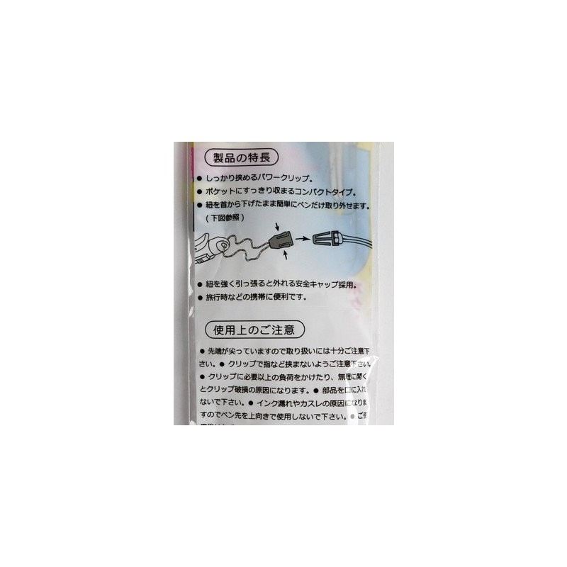 • A ballpoint pen that can be written in 3 colors (blue, black, and red). Ball diameter 0.7mm Oil-based ink. Safety cord for strong pull off. Pen can be easily removed with the string hanging from your neck. Comes with a power clip that can be securely attached to your pocket. Compact type makes it convenient to carry when traveling