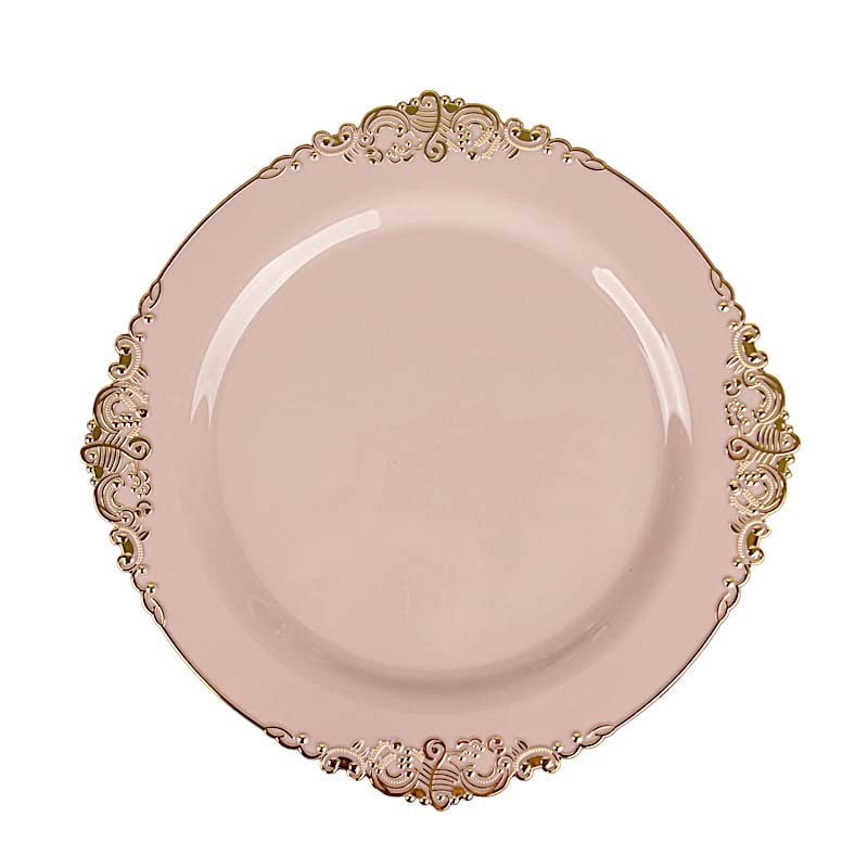 Balsa Circle 10 Blush Round 10" Disposable Plastic Salad Dinner Plates Gold Embossed Baroque Trim Party Events Reception Decorations Supplies