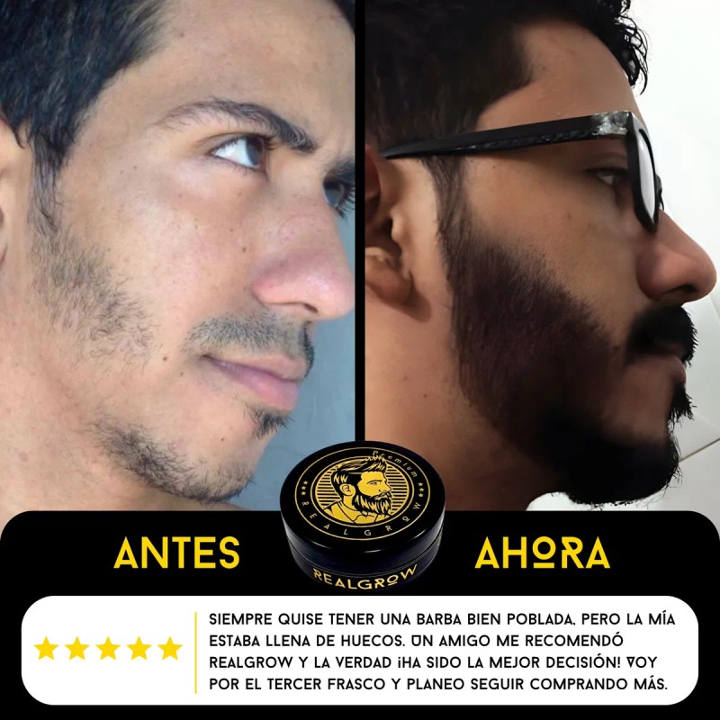 ¿Sera una barba más completa, mas poblada y mas tupida lo que buscas? ¡Pues déjame decirte que REALGROW es tu boleto dorado! Con una fórmula potenciada y cuidadosamente diseñada, este Bálsamo está aquí para ofrecerte resultados que te robarán una sonrisa (y unas cuantas miradas).