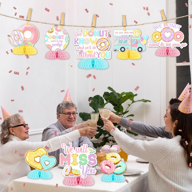 - Wide application: These donut farewell party table decors can be used in donut going away party, fiesta farewell party, donut career change party, donut farewell party, dessert party, donut retirement party, donut job change party, donut retirement party, we will miss you party, donut know what we would do without you party, we donut want to see you go party.