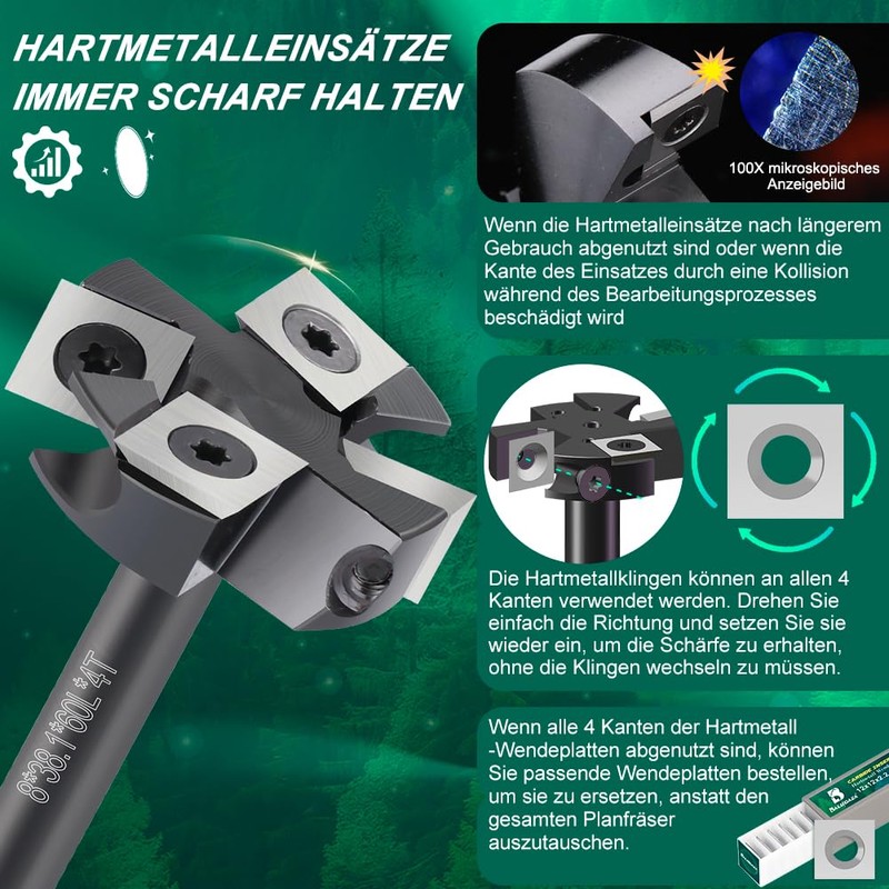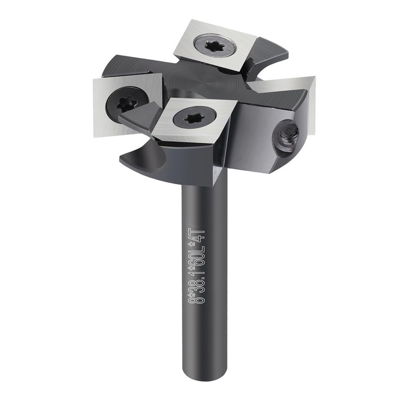 • Size: the 4-tooth face cutter has an 8 mm shaft and is made of high-quality carbon steel. Cutting diameter: 38.1 mm woodworking cutter with 4 pieces. 12 x 12 x 2.2 mm rotary inserts. RPM: 16000. Maximises the wood finish with safe operation