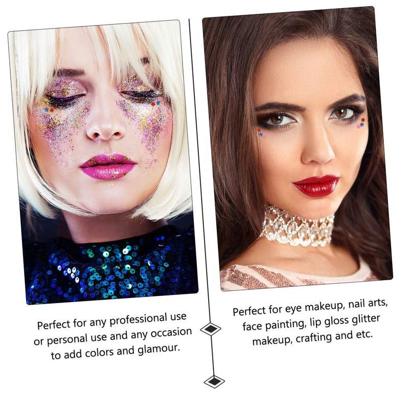 • Glitter sequins: for eye makeup, nail arts, body decoration, face painting, lip gloss glitter makeup, crafting and etc,multipurpose sequins