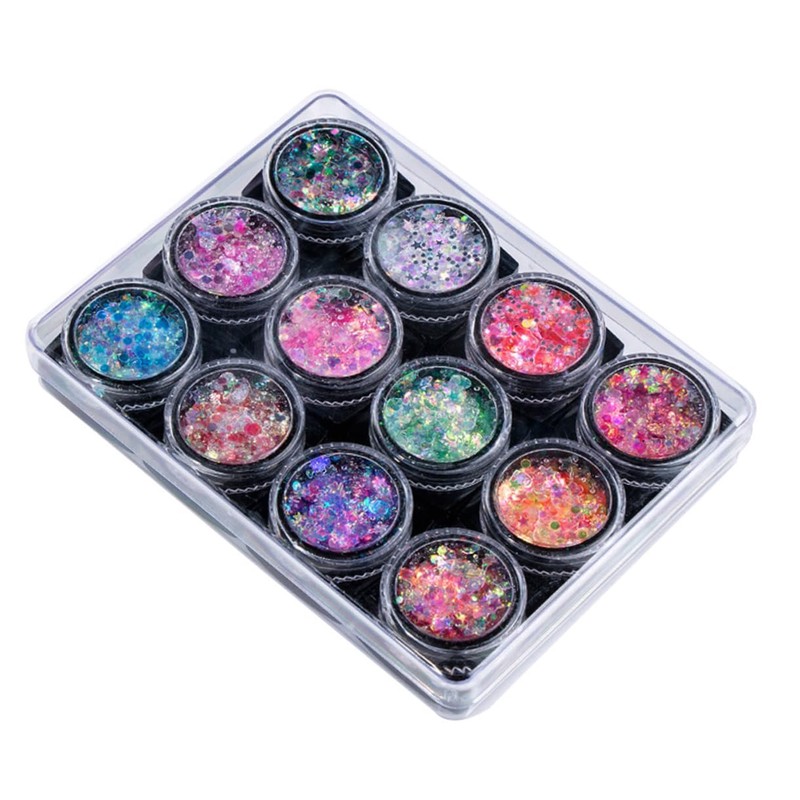 sequin body gel material with silky shine color, can last for all day long.sequins gel for body You can use it on body, face, nail, eye, etc.glashiny This is a set of 12 colors fashion sequined body gels.makeup sequins gel Buy it as a anyone, for any professional use or personal use