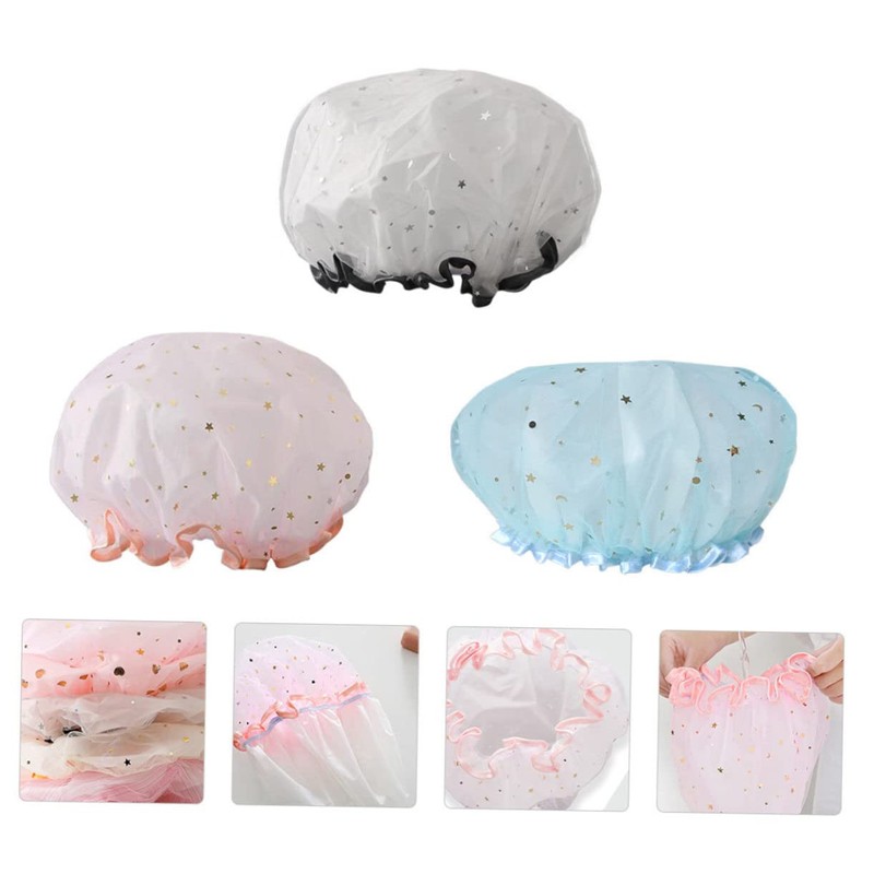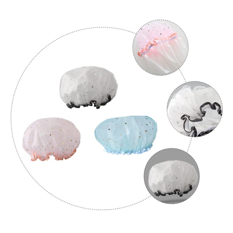 Multi-purpose Bath Caps These chic and pattern designed waterproof shower caps are made from quality and EVA and yarn mesh material, protecting your hair from getting wet.reusable shower cap The set of shower caps are easy on and off, convenient to wear and remove.Shower Cap Adjustable Super useful and practical!