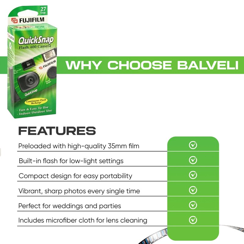 - Eco-Friendly And Ready To Use: Each Disposable Camera Bulk Pack Comes With A Balveli Microfiber Cloth For Keeping Lenses Clean, Ensuring Clear Shots Every Time. The Cameras Are Eco-Friendly, With Recyclable Parts And Packaging, Aligning With Sustainable Practices While Providing Exceptional Utility And Value.
