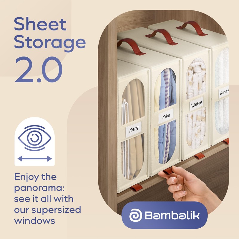 BAMBALIK 4x Bed Sheet Organizer Storage Boxes with Big See-Through Windows - Bedsheet Organizers Redesigned. Robust Bed Sheet Storage -15x13x5 in. Sheet Organizers and Storage Containers (Off-White)