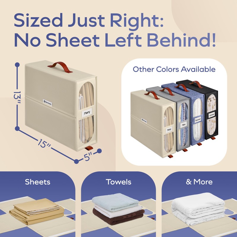 • STORE SMART. Stackable, foldable, and versatile: it’s a bed sheet organizers and storage box set that maximizes space efficiency whether used in linen closets, under beds, or in attics. It’s super compact to store away when you’re not using it