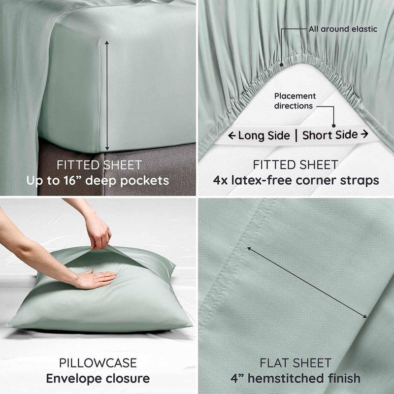 - Your Perfect Bedding Set: This 100% viscose derived from bamboo sheets king size set includes 1 king fitted sheet (78" x 80"), 1 king flat sheet (108" x 102") and 2 king pillowcases (20" x 36"). The pillowcases feature a sleek 8" envelope closure flap for a polished look and a secure fit, while the flat sheet is finished with an elegant 4" hem.