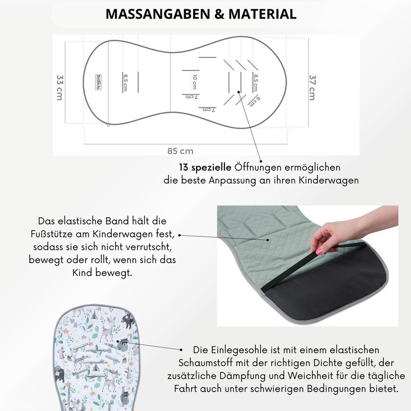 Practical and stays in place – protects the pram from dirt while being very breathable and does not cause chafing. Waterproof footrest at the foot end, made of easily washable fabric for maximum comfort with minimal effort. An additional elastic band when attached to the stroller holds the pad so that it does not slip, move or roll away when the child moves.