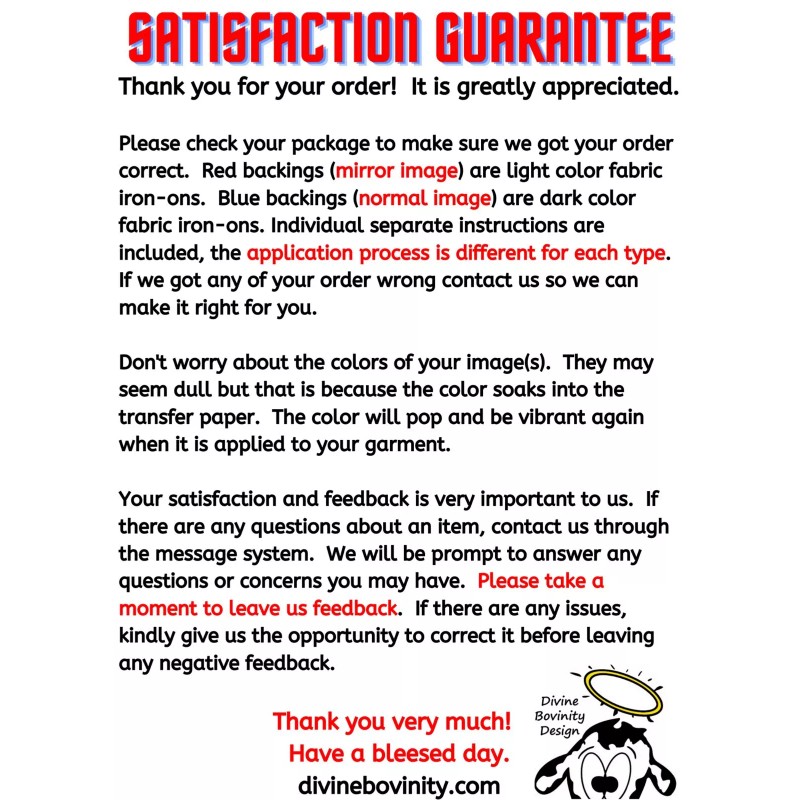 **PLEASE NOTE** We are not obligated to replace your iron-on if you make a mistake so,please read the instructions thoroughly and take your time.  Also, if you want a smaller size, pleasemessage us and we can try to size it as close as we can.
