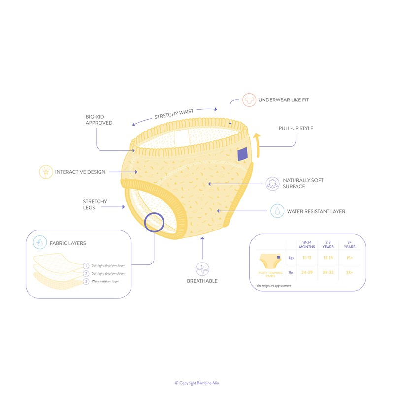 - Die wasserabweisende Innenschicht und das saugfähige Polster sind für kleine Missgeschicke geeignet!