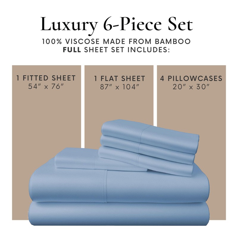 Bamboo Bay 6 Piece Full Size Bed Sheets Set - 100% Viscose Made From Bamboo Sheets Full Size Set - Ultra Soft Cooling Sheets for Hot Sleepers - Full Size Sheets Set Fits Up to 16" Mattress, Light Blue