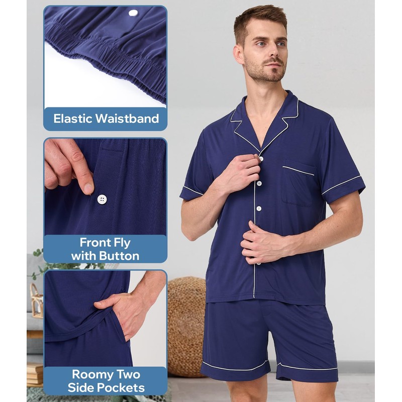 BAMBOO COOL Mens Pajama Set Summer Cooling Pjs Button Down Shirts Short Sleeves, Lightweight Loungewear Pijama with Pockets Navy Blue