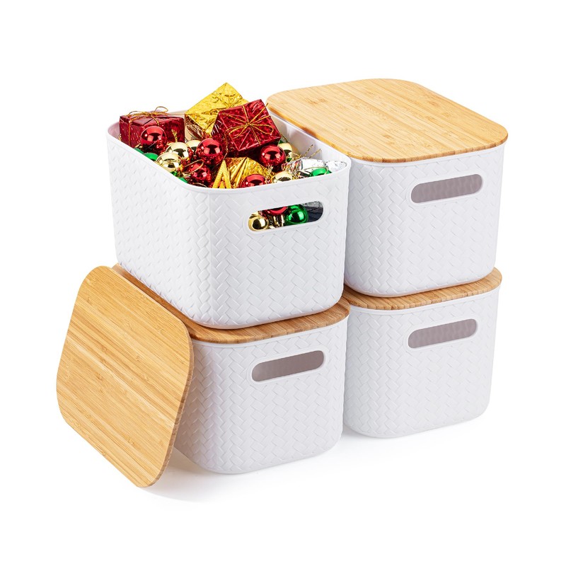 - BAMBOO LAND plastic storage baskets with bamboo lid come in a set of 4, making them perfect for organizing and decluttering your home or office.