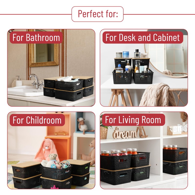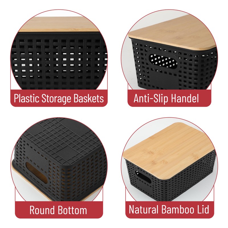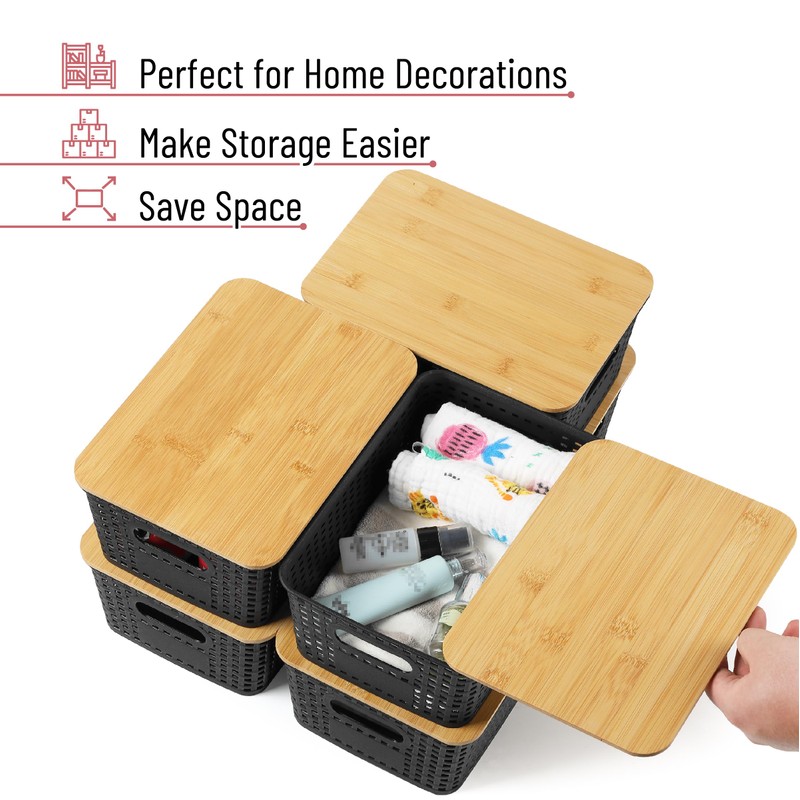 BAMBOO LAND- Plastic Storage Baskets with Bamboo Lid, 6 pcs, Black Small Storage Bins Small, Plastic Storage Basket with Lid, Pantry Storage Baskets with Lids, Storage Basket Plastic