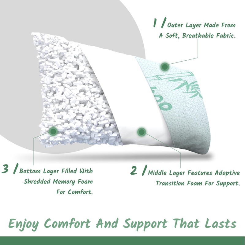 Breathable pillow molds, shapes, and aligns to any sleeping style, including stomach, back, and side sleepers. Queen Pillow Measures: 19" x 28" King Pillow Measures: 19" x 36" Provides relief from several sleeping issues, including snoring, insomnia, migraines, neck and back pain, allergies, and TMJ . allows for optimal comfort, cooling, and air circulation during sleep. Machine washable zippered bamboo and polyester blend cover