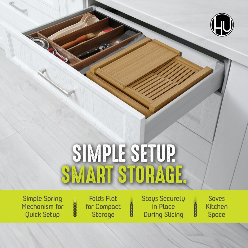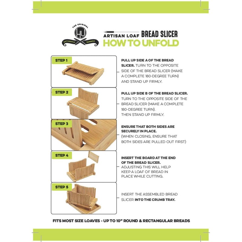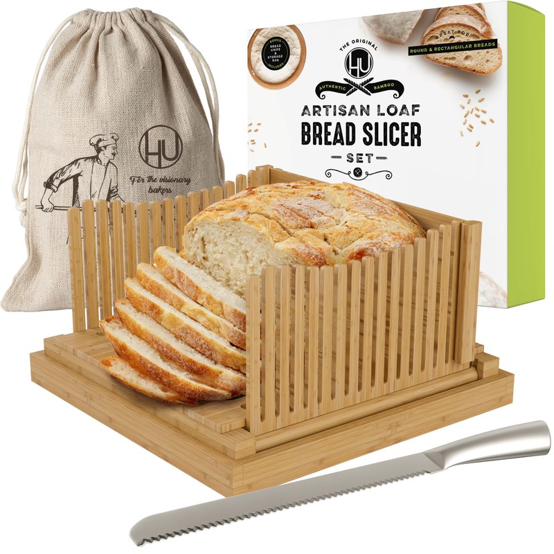 Everything you need is included to make bread-slicing easy. The extra-long 10” knife makes quick work of XL loaves, while the eco-friendly bamboo adds both durability and a natural look to match your kitchen. Plus, the bread storage bag keeps your loaf fresh so you can slice as you go. PERFECTLY EVEN SLICES, EVERY SINGLE TIME - Tired of uneven slices ruining your perfect loaf? This homemade bread slicer lets you adjust to slice bread at one of three thicknesses: 0.25", 0.38" or 0.5". Use the bread slicing guide to hold your loaf steady, then cut perfect slices, no matter the shape or size of your loaf! MADE FOR BIG ROUND & RECTANGULAR LOAVES - Worried it won't fit your favorite round bread? Don't be! Our bread cutter is for homemade bread, and unlike others, is specially designed to handle extra-large round loaves. It easily fits rectangular loaves too. Cut any bread without worrying about it slipping or not fitting. PREVENT MESS WITH CRUMB CATCHER TRAY - We know the struggle of cleaning up after slicing bread... crumbs everywhere! That's why our bread slice guide comes with a crumb catcher tray to keep your countertop neat & tidy. It also functions as a stylish serving tray and holds the slicer in place so it doesn't slide around. KIT INCLUDES 10" BREAD KNIFE & STORAGE BAG - Struggling to cut through large loaves? We’ve got you covered with our extra-long 10” bread knife designed specifically for big loaves. And once your bread is sliced to perfection, you can store it in the eco-friendly bread bag (15.75" x 11.75"), keeping it fresh for longer. Slicer: 11.75" x 11.75" x 6.5" H. Tray: 12.5" x 12.5" x 1.5" H