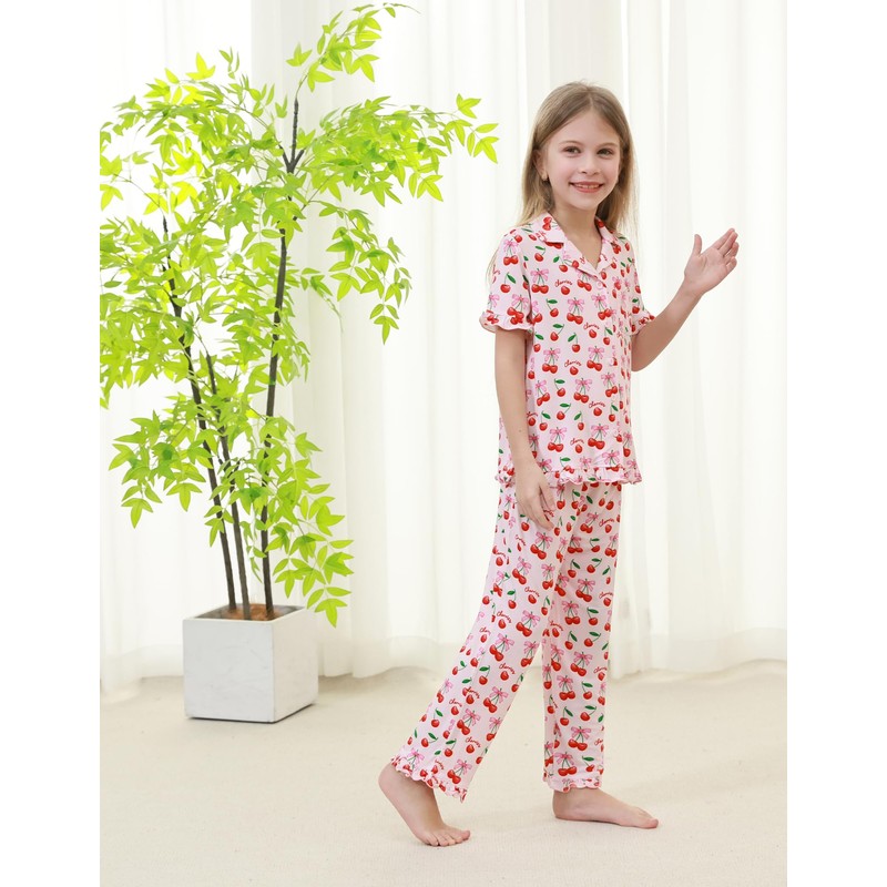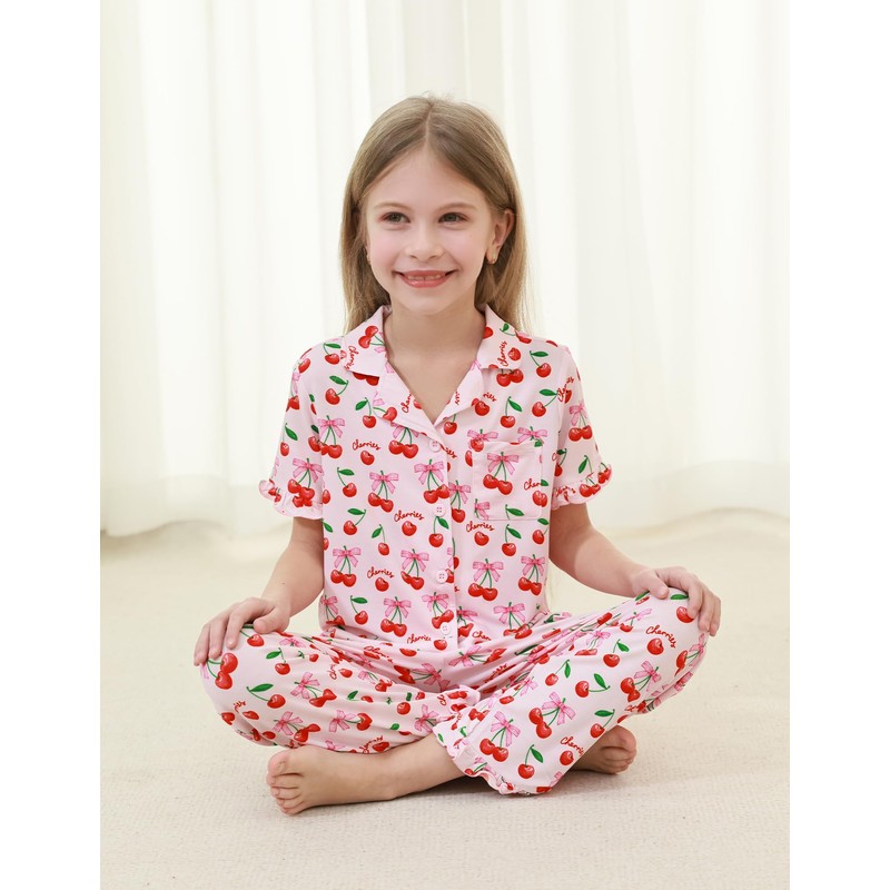 BambooBud Girls' Pajamas Kids Toddler 2 Piece Pjs Set Button Down Sleepwear Viscose from Bamboo Clothes Sets 4-10Y, Cherry with Bow, 7-8Y