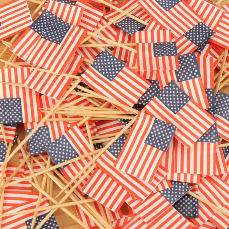 - AMERICAN FLAG END BAMBOO PICKS Decorative red, blue and white American flag bamboo skewers swizzle toothpick sticks, approx 4.7 inch, flag measure approx 3.5cm x 2.5 cm, 300 Pieces
