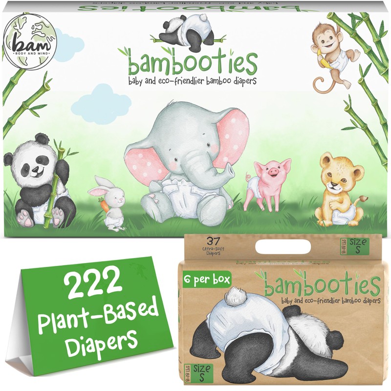 Bambooties Bamboo Baby Diapers, Totally Chlorine Free for Sensitive Skin for Newborns to XXL. Hypoallergenic & Non Toxic Eco Friendlier Plant-Based Materials. TCF Small Size 1 to 2 (222 ct)