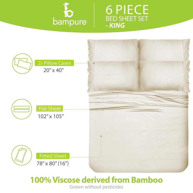 BAMPURE Luxury Series 6 Pcs King Sheet Set - 100% Viscose derived from Bamboo Sheets King Size - Super Soft Viscose Bamboo Cooling Sheets for Hot Sleepers -Up to 16’’ Deep Pocket King Sheets (Ivory)
