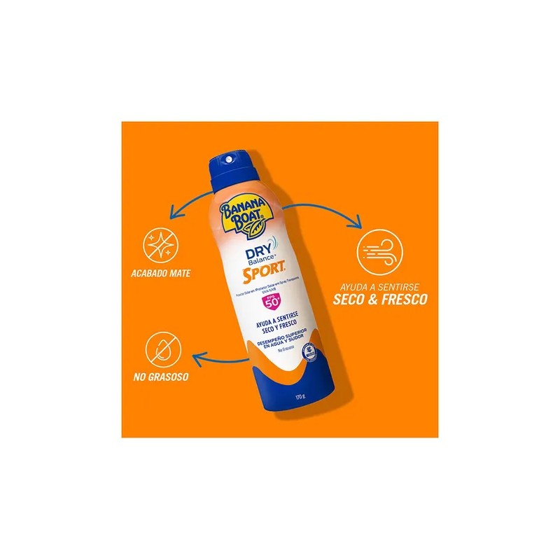 Banana Boat Dry Balance Sport en C-Spray, es un protector solar ideal para las actividades al aire libre, te ayuda a sentirte seco y fresco, mientras te protege de los rayos del sol.