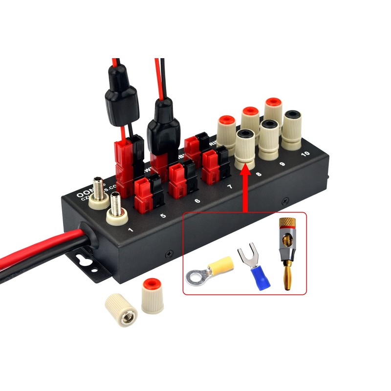 - Connections: 6 positions power pole socket, can compatible 15A, 30A or 45A power pole connectors. 4 positions high current brass (nickel-plated) standard banana jacks, support standard banana plugs, 1/4 (6.4mm) ring / spade terminals. (Note: the item not include power pole plug, banana plug, 1/4 ring / spade terminals).