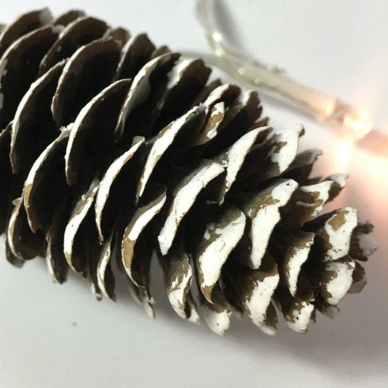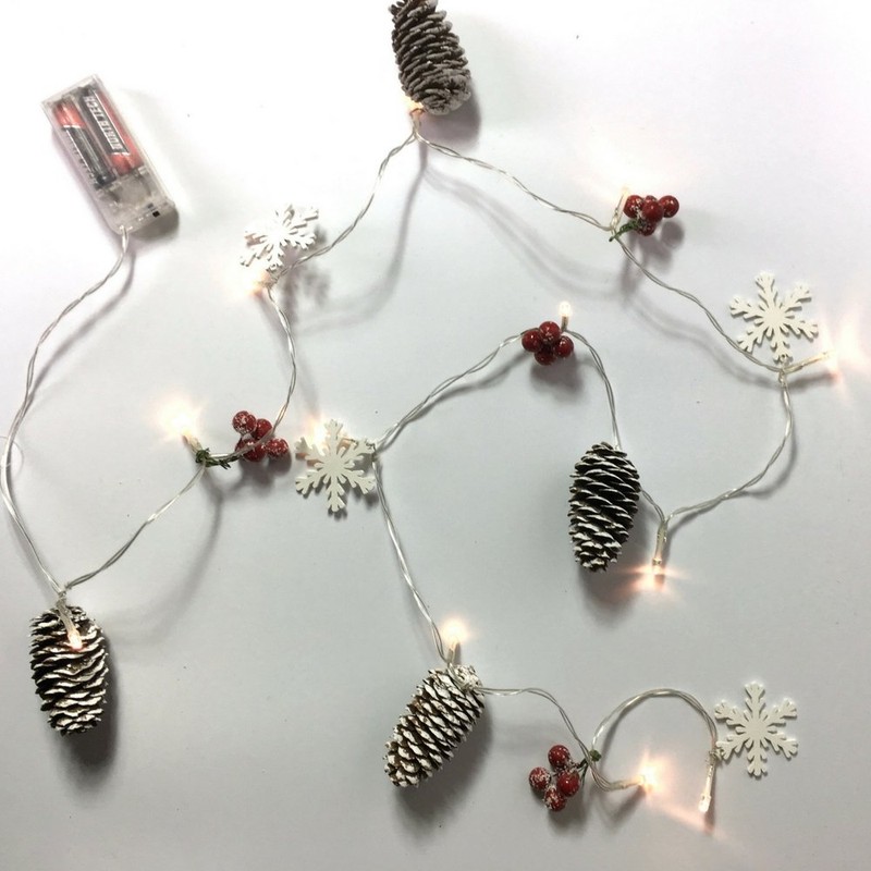 - PINE CONE GARLAND. This is the cutest lighted Christmas garland. Each strand contains real snow covered pine cones, red pip berries and white wooden snowflake ornaments. Use these garlands on your mantel, around your Xmas tree or in your holiday front door wreath.