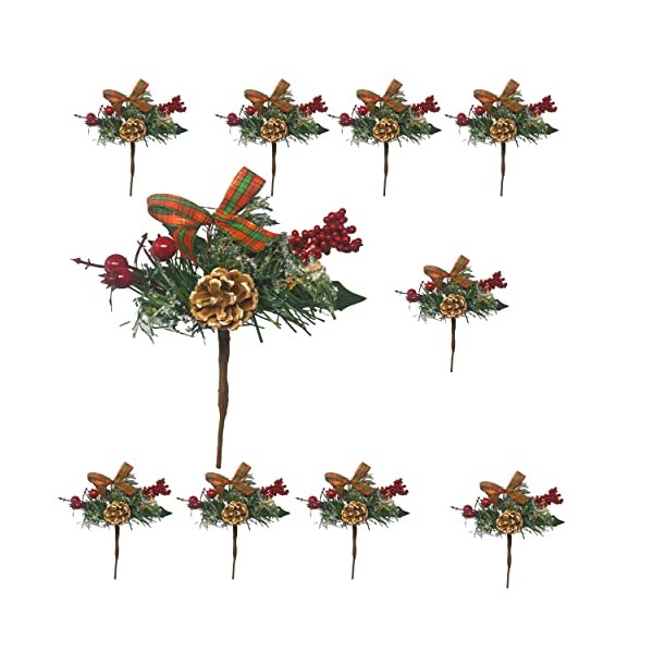 - RED BERRY PICKS with real pine cones. Set of 10 stems each one measures approx. 8" long and the stem is approx. 5". They are bendable so they will work with all your holiday decorating.