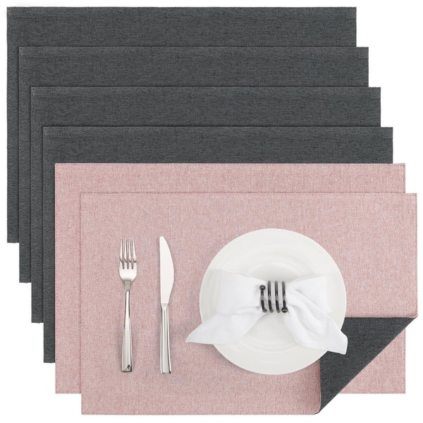 Banchif Place Mats, Faux Linen Placemats, Washable Place Mats, Double-Sided Place Mats, Fabric Place Mats, Machine Washable, 30 x 45 cm (Grey/Pink, Rectangular Set of 6)