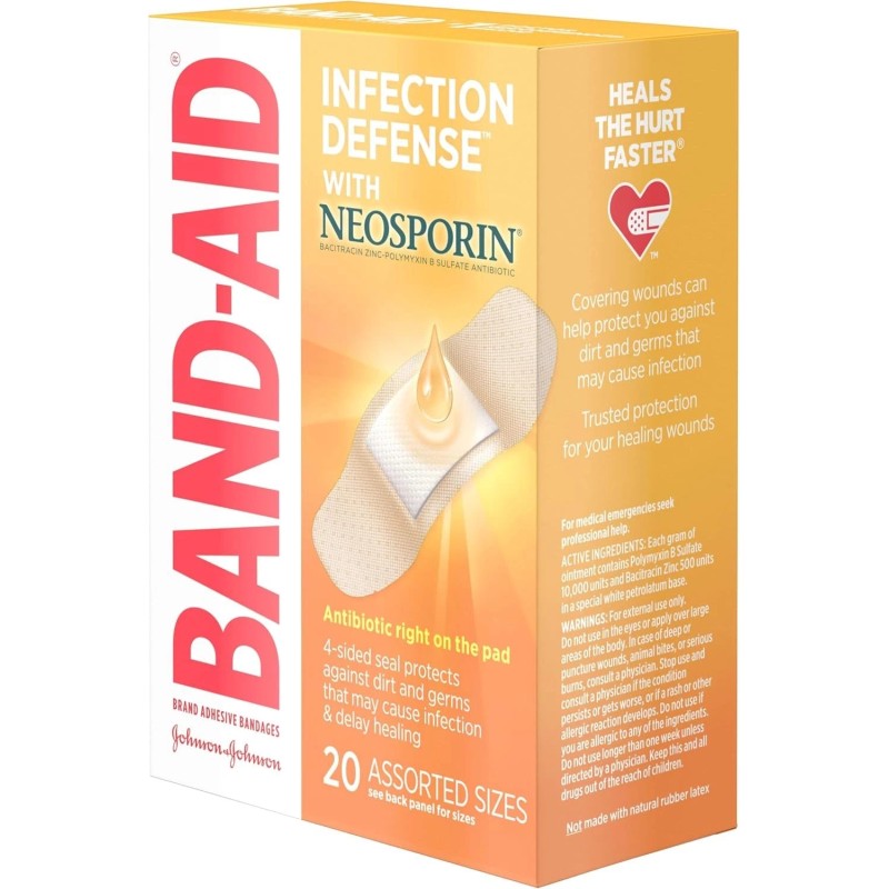 Get mess-free infection protection with Band-Aid Brand Adhesive Bandages Infection Defense with Neosporin. In assorted sizes, these sterile bandages have Neosporin antibiotic ointment right on the pad, and provide a 4-sided seal that protects against dirt & germs that may cause infection & delay healing. These Band-Aid Brand Adhesive Bandages also have a Hurt-Free Pad that won't stick to the wound, allowing for gentle removal. This package contains 20 antibiotic bandages in a variety of sizes.