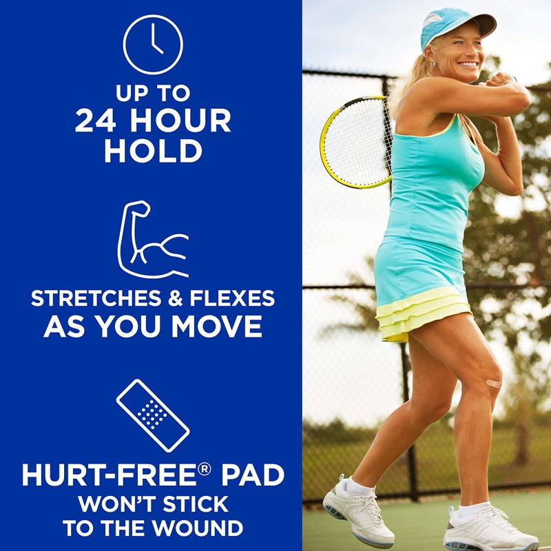 • These Band-Aid Brand Flexible Fabric adhesive bandages stay on for up to 24 hours and feature a unique Hurt-Free Pad that won't stick to the wound as they wick away blood and fluids, allowing for gentle removal
