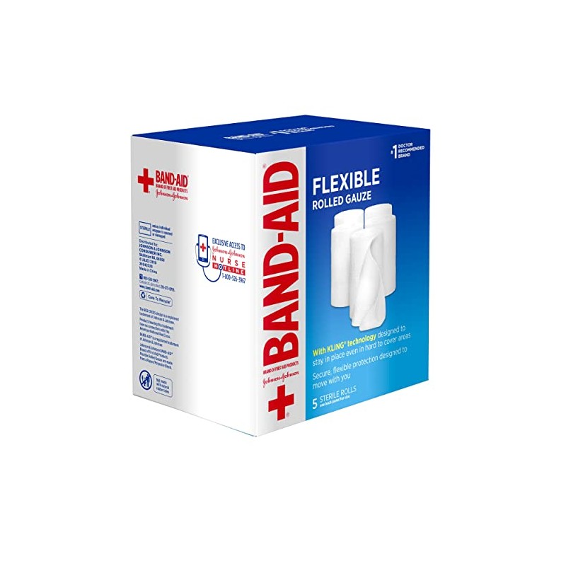 - 5-count of 3-Inch Band-Aid Brand of First Aid Products Flexible Sterile Rolled Gauze Dressings to secure wound dressings, gauze pads, and nonstick pads in hard-to-bandage areas