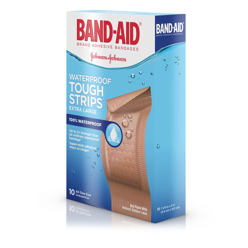 Band-Aid Brand Tough-Strips Waterproof Adhesive Bandages block water, dirt, and germs--even when the area gets wet. These durable bandages are made from Dura-Weave heavy-duty, waterproof fabric with a strong adhesive to stay on longer. The QuiltVent pad has air channels for superior breathability and wicks away blood to keep the wound clean. Please note that Band-Aid Brand Tough-Strips are not recommended for sensitive or delicate skin. This package contains 10 extra-large sterile bandages, each measuring 1.75 by 4 inches.