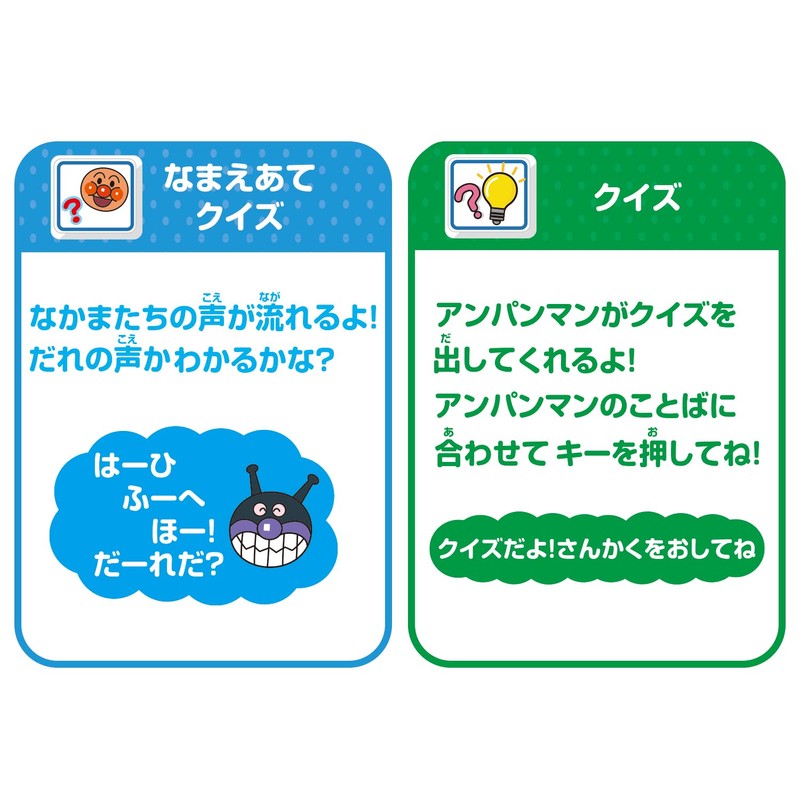 - While music is playing, you can play with the kumban key and instrument key while the music is playing. You can also try to challenge Anpanman quizzes or move the lever to slide the screen