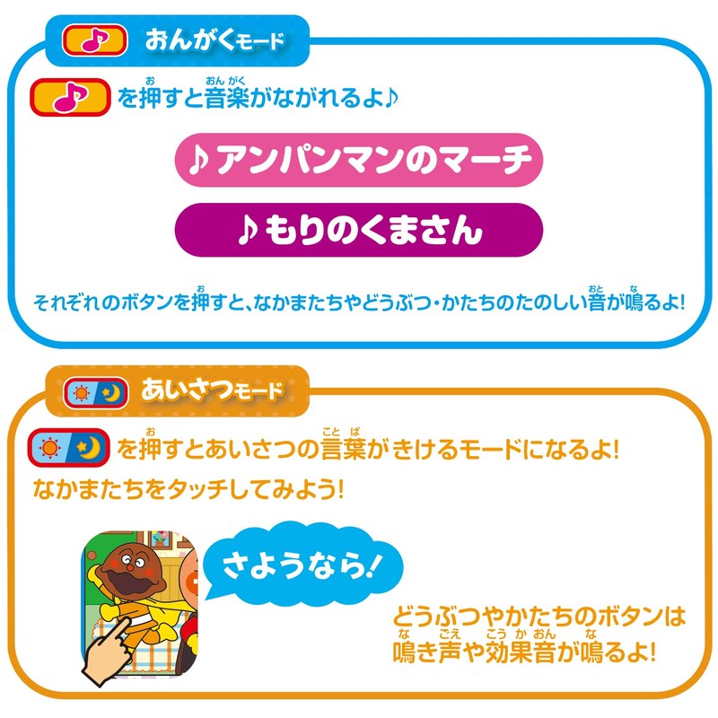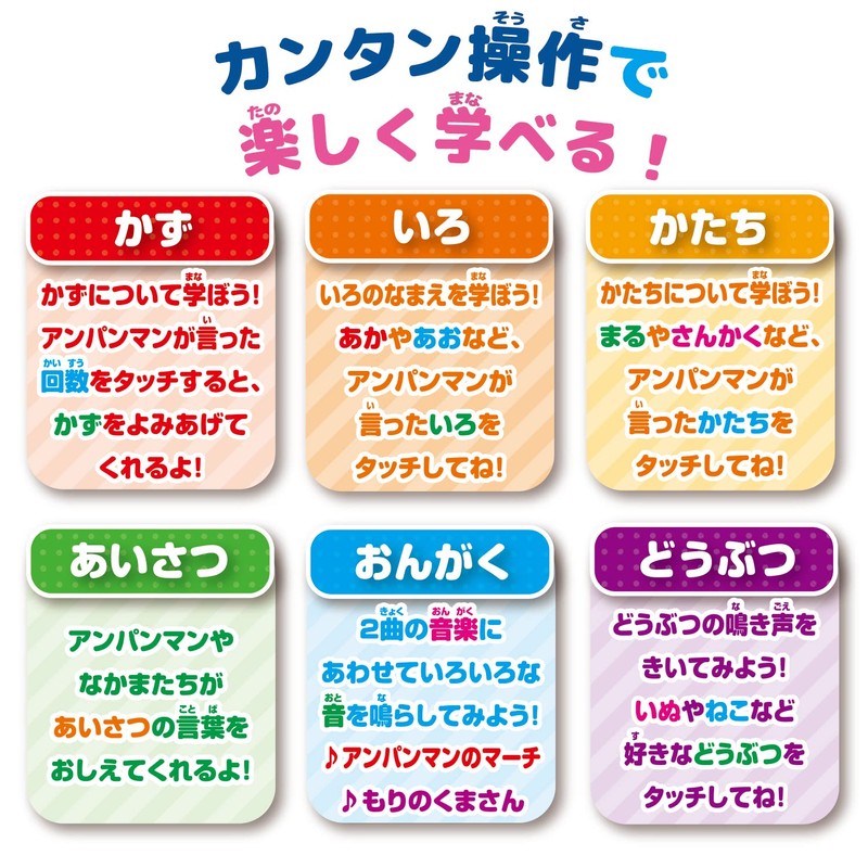 • The Anpanman Color Pad Mini has also been renewed with plenty of educational menus. Even at home! Great for going out. This is a pad type educational play item that can be used anywhere