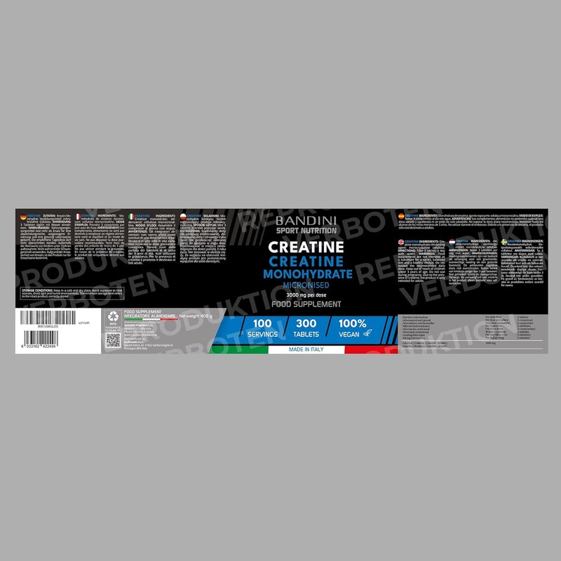 - High dosage, high performance. Dietary supplement based on pure creatine monohydrate. Each pack contains 300 tablets for 100 uses (1 daily dose = 3000 mg of creatine). Made in Italy.
