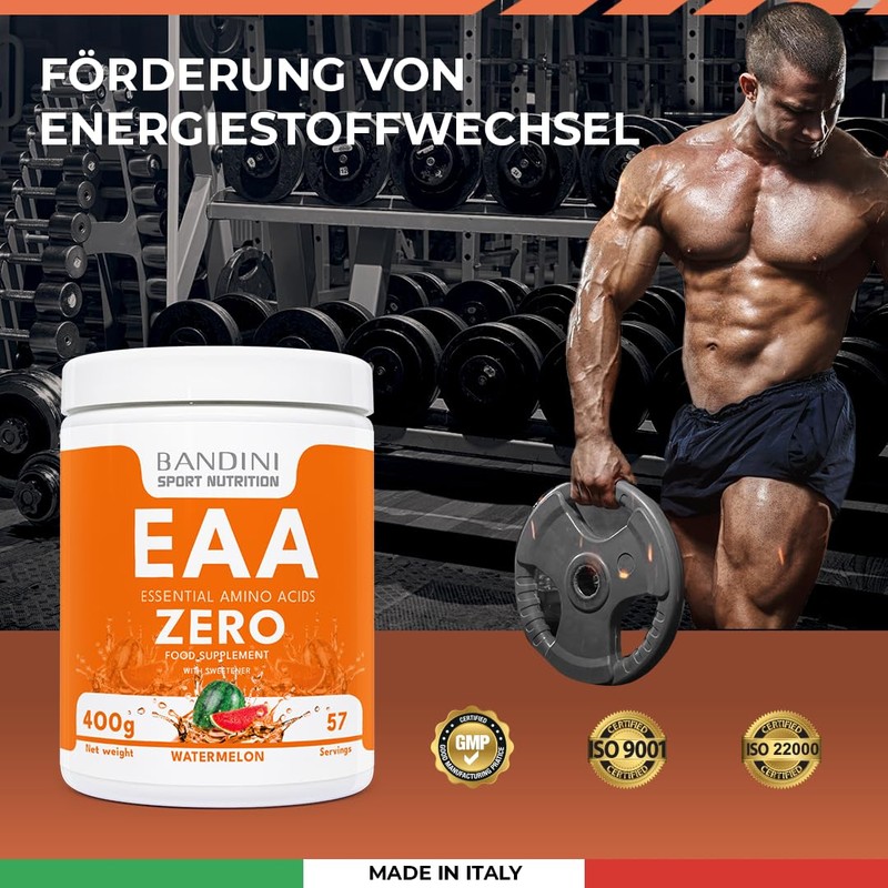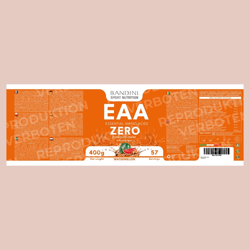 - High performance. Dietary supplement based on essential amino acids: L-leucine, L-lysine, L-phenylalanine, L-isoleucine, L-valine, L-methionine, L-threonine, L-histidine, L-tryptophan. Pack of 400g, contains 57 cans. EAA Bandini Pharma has been tested to maintain and build muscle mass, support muscle mass and promote their growth. They provide the right dose of amino acids, including essential amino acids, and supplement diet and sports nutrition.