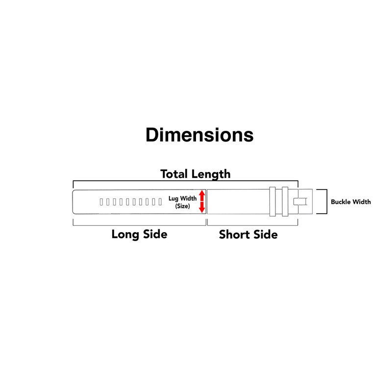 DIMENSIONS: Band Width (Lug x Buckle End): 20mm x 18mm | Long Side: 4.33 inches (11cm) | Short Side (without buckle): 2.76 inches (7cm) | Total Band Length (without Buckle): 7.09 inches (18cm) | Band Thickness: 0.08 inches (2mm)