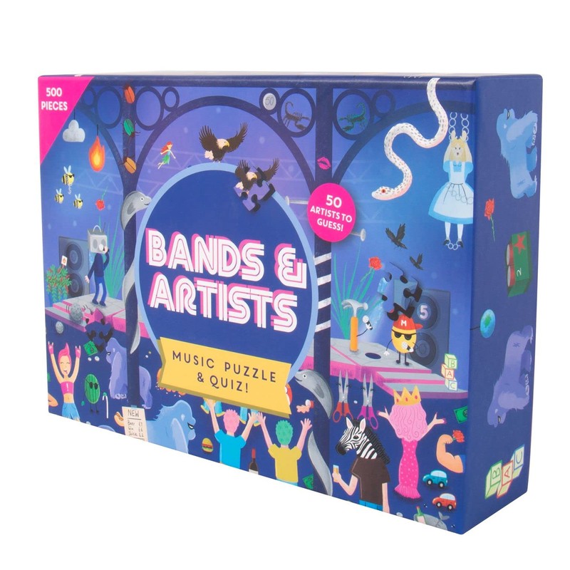 Bands & Artists Music Puzzle & Quiz. 500 Piece Jigsaw Puzzle with 50 Hidden Song Titles. Quiz Sheet & Answers Included. Music Work as a Team or Head-to-Head Fun Quiz Game.